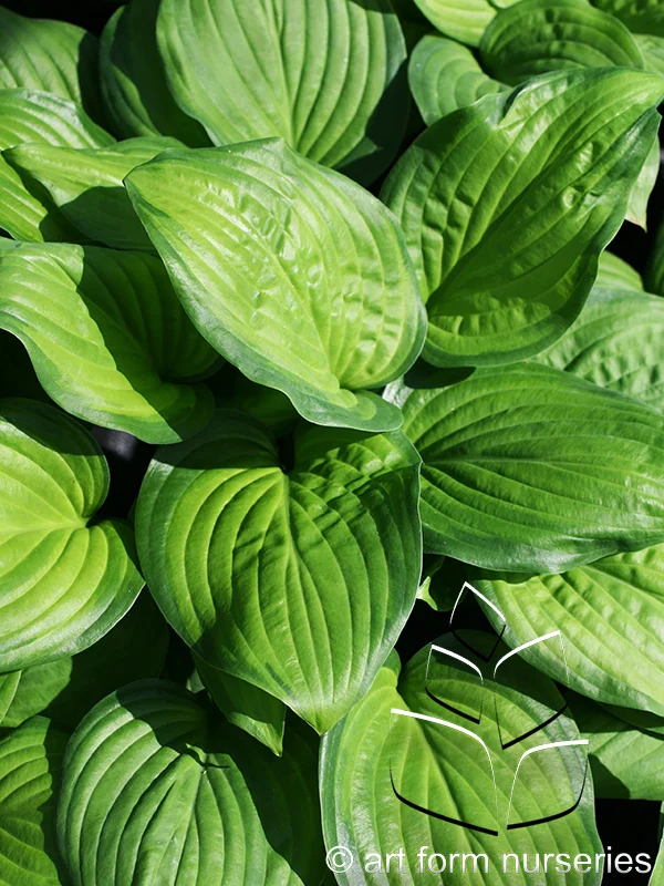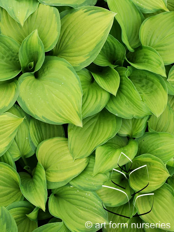This medium size hosta is a showy sport of 'First Frost'. Leaves emerge frosty blue with bright yellow margins, which lighten to creamy white during summer. Holds up late in the season. Light lavender flowers mid to late summer.